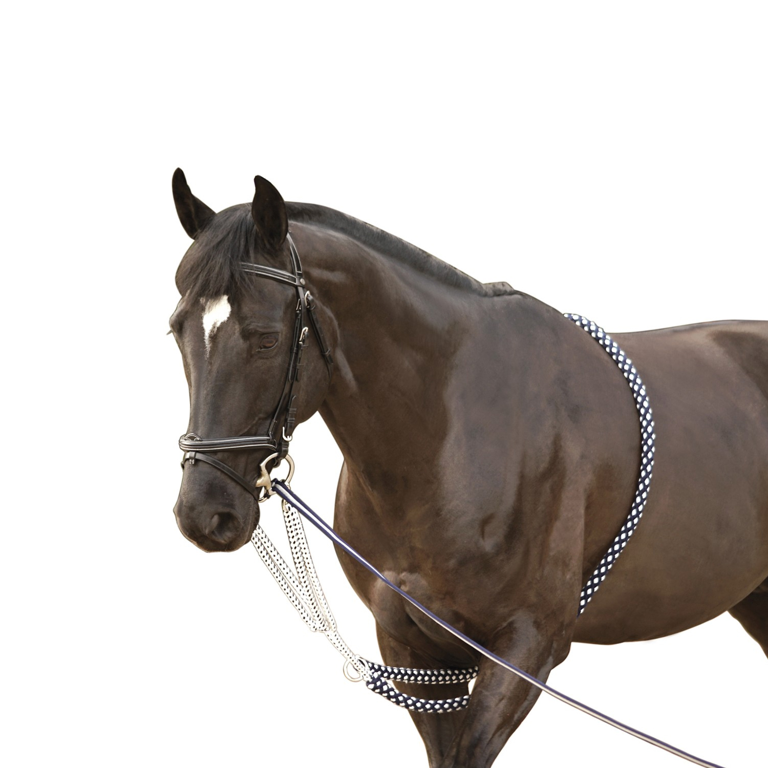 Лонжа (5,5 м) с двумя карабинами, за счет которых легко регулируется.