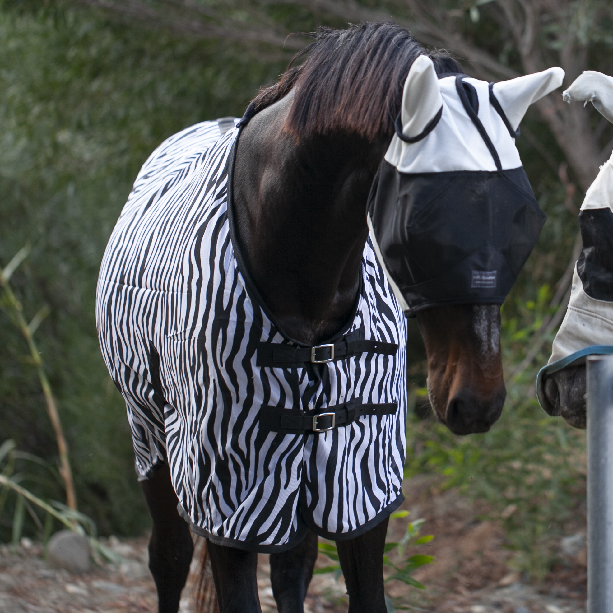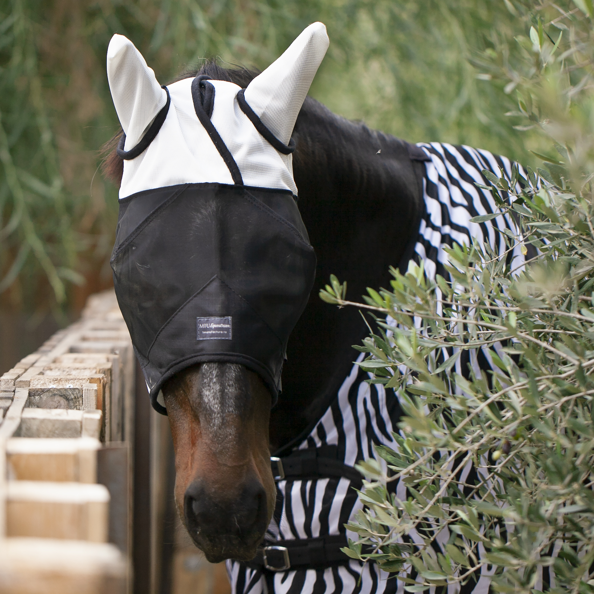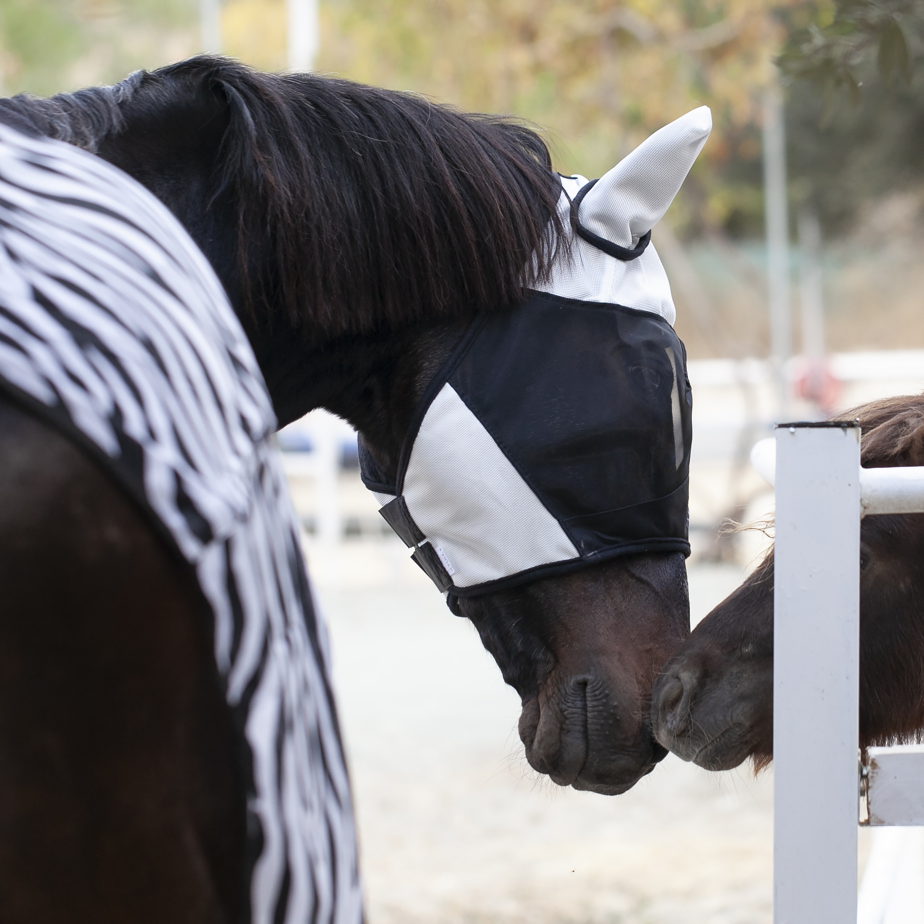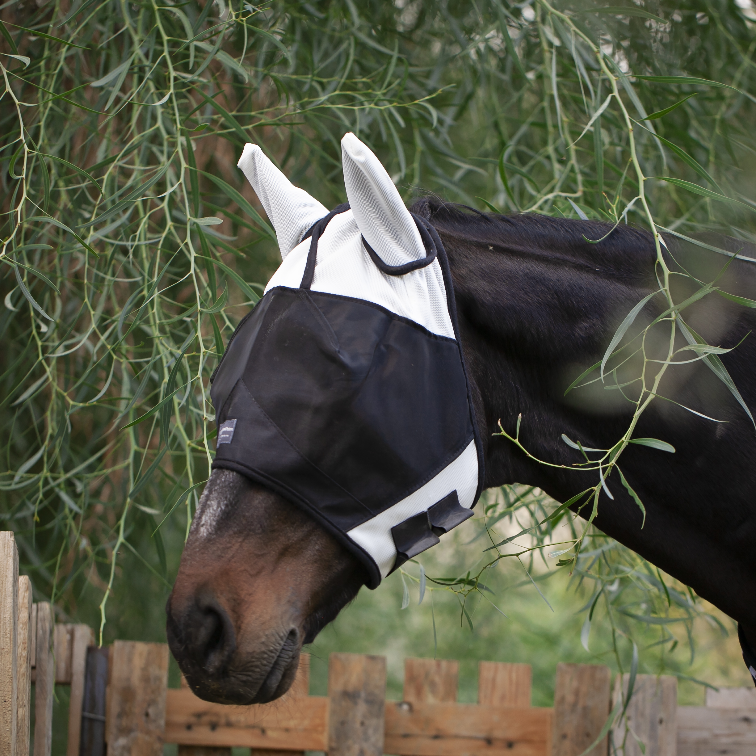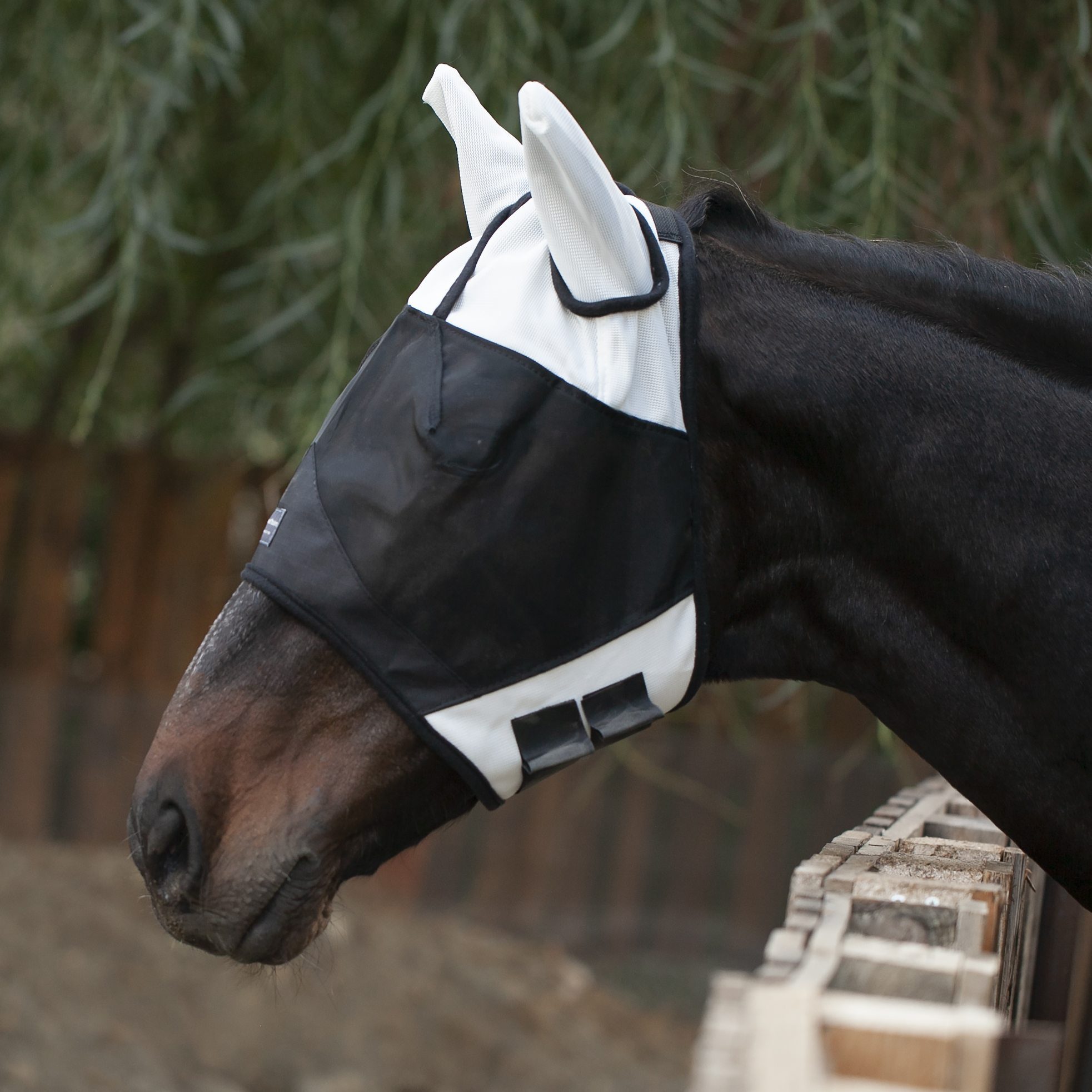 Верхняя часть маски выполнена из прочной белой сетки, которая отражает солнечные лучи и создаёт лёгкую воздушную подушку — это предотвращает перегрев и делает маску особенно удобной для длительного ношения. Материал работает как «солнечные очки» для лошади: обеспечивает превосходную видимость, отличную вентиляцию и защиту от ультрафиолета.
